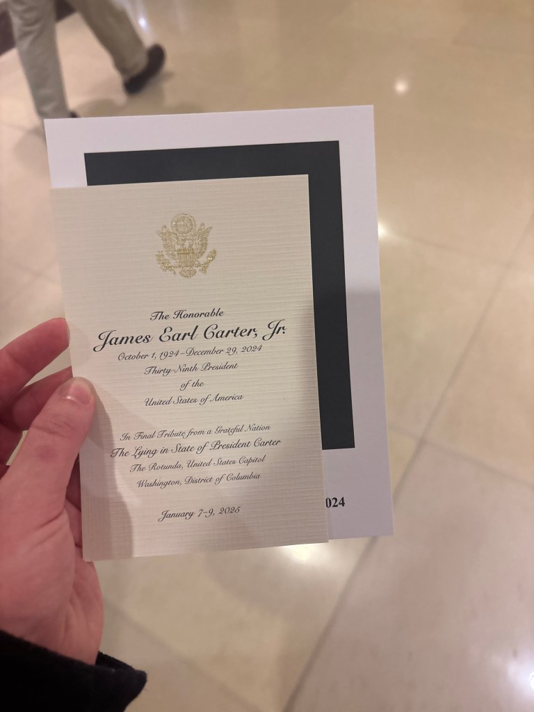 Photo of paper received at former President Jimmy Carter’s memorial at the Capitol Rotunda. Photo by Liv Swaney and caption by Eli Benson
