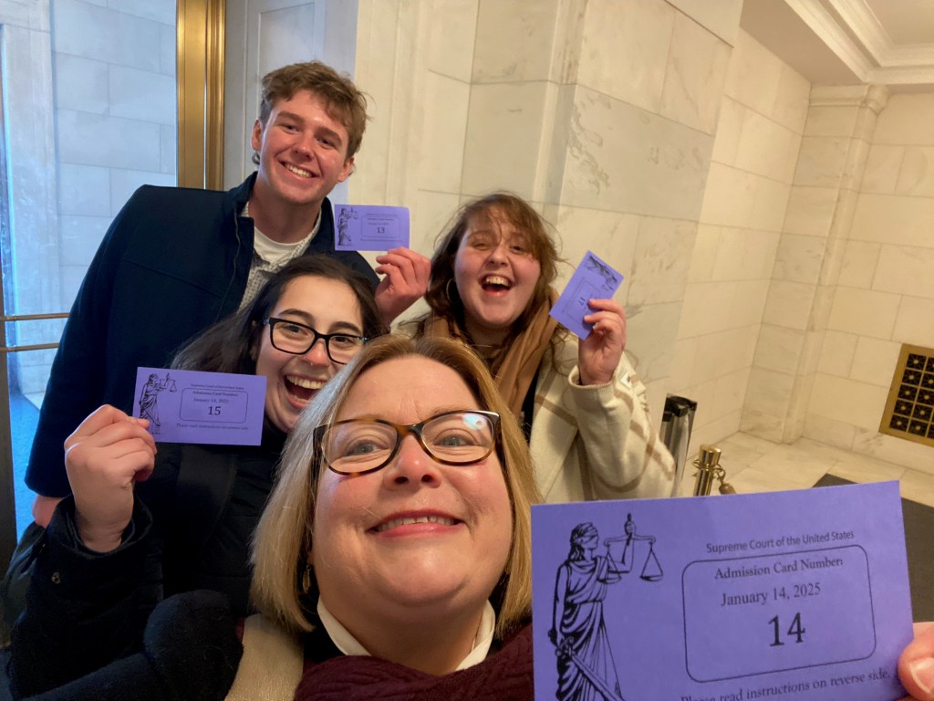 (RPC, Eli, Hannah, and Fran with their Supreme Court tickets…finally!!)