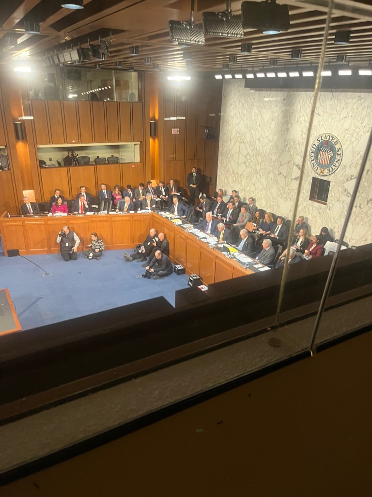 When Bondi’s hearing went into recess for lunch, I had a thoughtful conversation with one of our professors on this trip, Rachel Paine Caufield (RPC). She was admiring the interrogation skills and conviction of the women in the room, including Bondi. Not only were they able to ask questions with confidence but keep their composure during fiery lines of questioning. RPC recounted how she looked to women in office as models of proper attitude, finding that they don’t show their rage and stay engaged in the conversation, no matter how infuriating a situation may be.