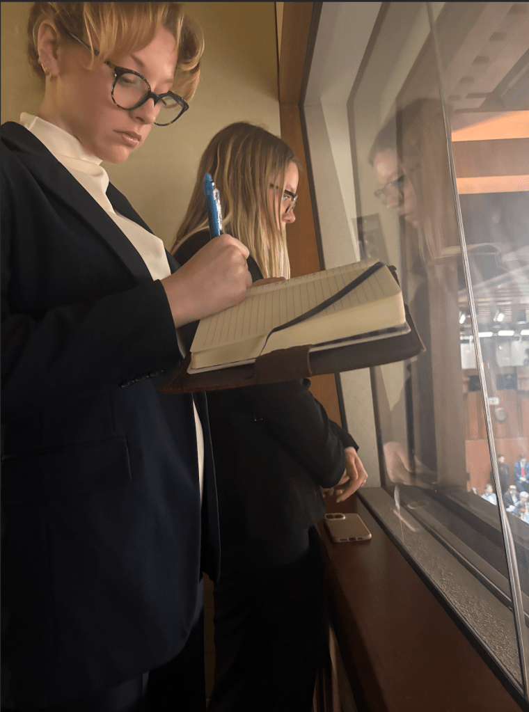 Group member Amanda F. and peer aya H. taking notes and observing Pam Bondi’s hearing. Photo taken by Liv S.