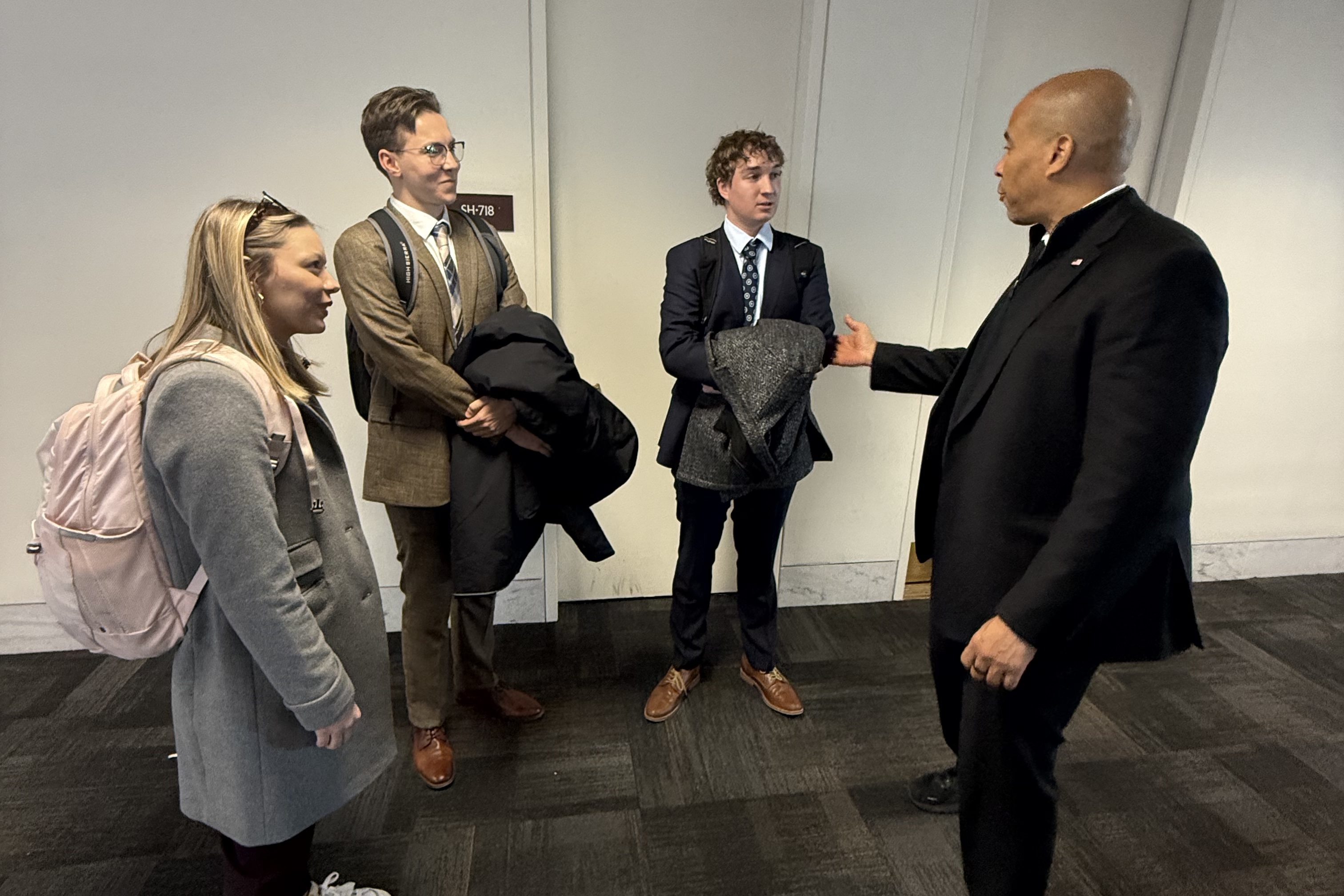 Although this was an out-of-the-ordinary situation, the Senators, yes multiple, were in their element and perfectly navigated their way through the swarm of media up to the floor to vote. Fighting through the hundreds of reporters, we looked inside the floor of the Senate and witnessed history as Senators were voting on a bill. On the trek back to the Hart office building Booker again was trapped by reporters but masterfully answered questions while dodging others and quickly we made it back to the office where he again talked to us for several minutes about our careers and where we wanted to go in life.