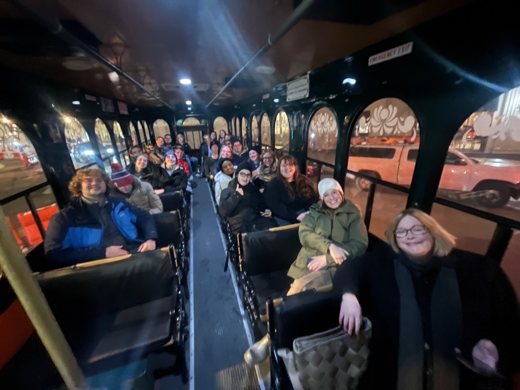 Exploring D.C. on a trolley for a night monuments tour. The group got the chance to visit the Washington Memorial, Lincoln Memorial, Vietnam Memorial, Martin Luther King Memorial and more!