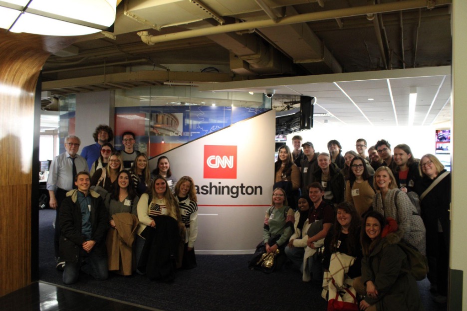 On Monday, Jan. 13, the group visited the offices and studio of CNN Washington. Pictured are group members in Jake Tapper’s studio where he films “The Lead with Jake Tapper.” Photograph taken by Bridget Sullivan at CNN and caption by Amanda Favazza.